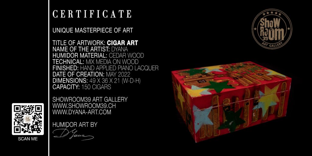 Aus der Kooperation des SHOWROOM39 mit DYANA ART DESIGN entstanden diese einzigartigen und individuellen Humidore. Was machen die Humidore so speziell? Jeder Humidor ist ein einzigartiges Kunstwerk (1 von 1). Zudem finden bis zu 150 Zigarren in unseren hochwertigen Humidoren Platz.
